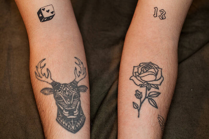 Das erste Tattoo dass ich Emanuel stechen durfte war noch im Secret Parlor Tattoo Studio an der Feldbergstrasse Ecke Klybeckstrasse, ich denke das war so 2017 oder 2018? Auf jeden Fall war Emanuel gerade 18 und wollte einen Hirsch im Grafik Stil.
